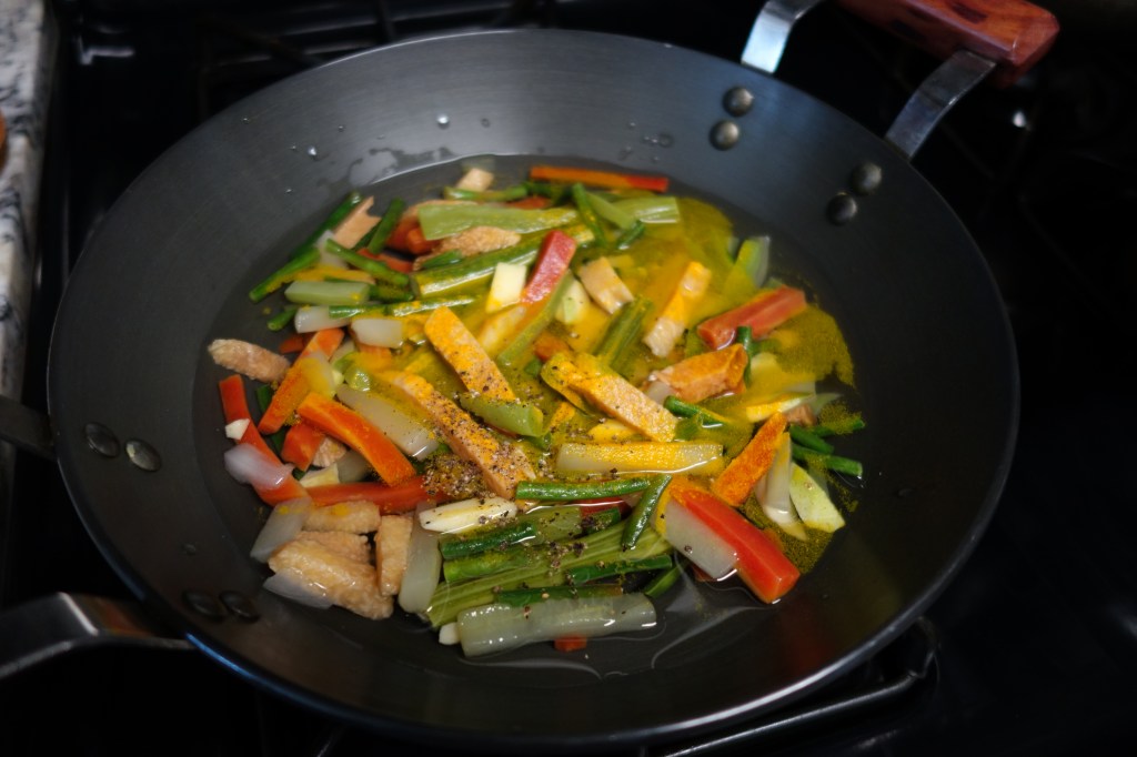 - If all water evaporates, add a couple of tablespoons at a time to cook the veggies
