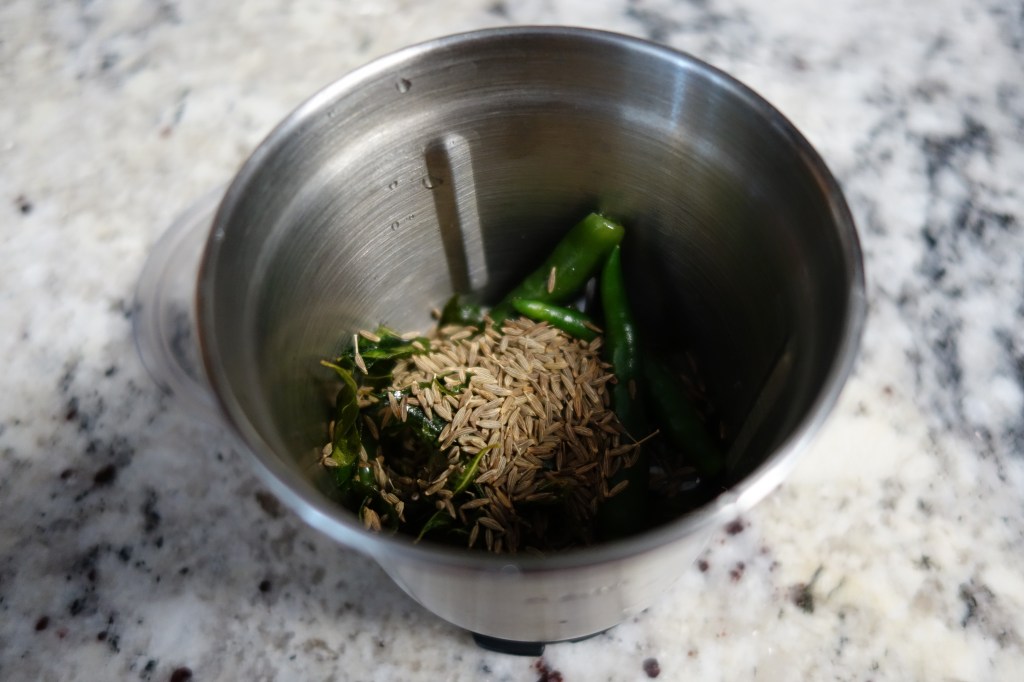 - While the veggies cook, make a paste of the coconut, cumin seeds, chillis, curry leaves and optional cloves of garlic