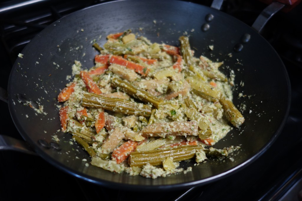 - Once the veggies have cooked through, add the coconut mix to the veggies