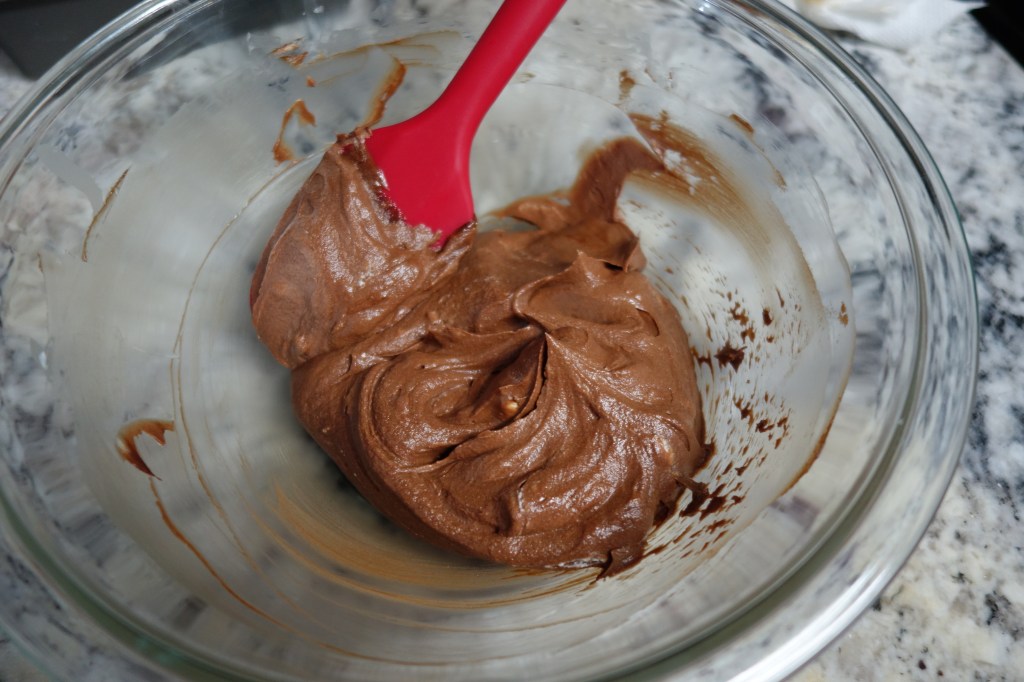 - Now fold in the cooled chocolate ganache in 3 batches. The first 2 batches are to be just folded in and need not be perfectly mixed in. The 3rd batch evens all out. For this, a larger flat spatula would work the best.