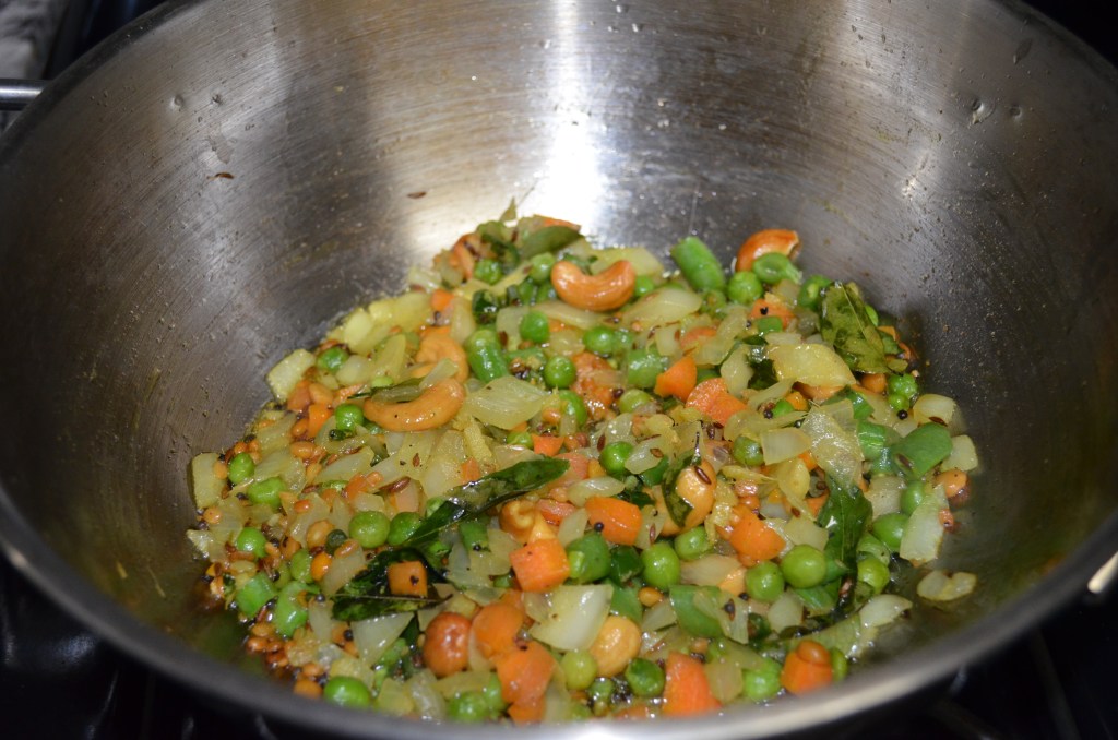 - Add in the rest of the veggies now – carrots, beans and peas. I used frozen peas, so they cooked rather quick