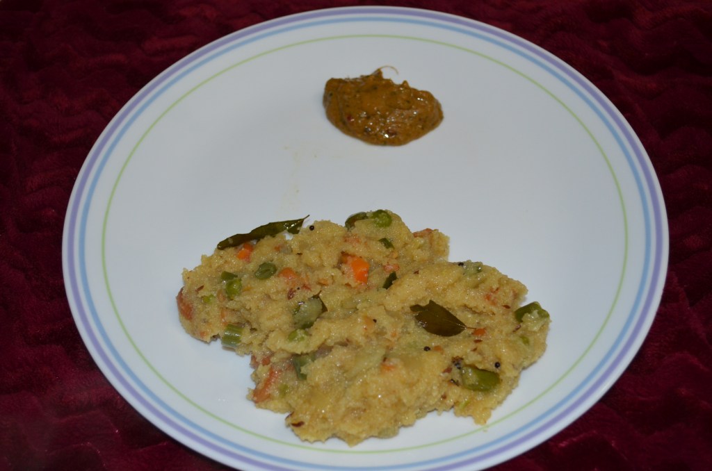 This is usually served for breakfast with chutney, though I make it for dinner too occasionally and serve it with chutney and sambar to make it a heartier meal. It is also a very flexible and very forgiving recipe. You can make it really indulgent by using just ghee and lots of cashew nuts or tone it down by using a mix of oil and ghee. You can roast the sooji or skip it if in a rush. You can add as many veggies you want to it or keep it relatively simple and just use onion and/or potato. I have done all the above and love each variation!