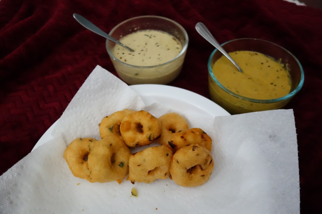 I have seen my mom and mother-in-law make these very often. Either for festivals or when feeling like a fancier breakfast or snack, this was one of the default preparations. And they have managed to prepare vadas with such ease that I took it for granted. When I attempted vada for the first time, everything that could go wrong did go wrong. The batter was too loose, I was unable to shape them, it would stick to my hands, gosh! I finally just dropped these as little balls of batter into the hot oil and fried them. That tasted good too, but that was the moment I realized that vadas take a little bit of skill and learning.