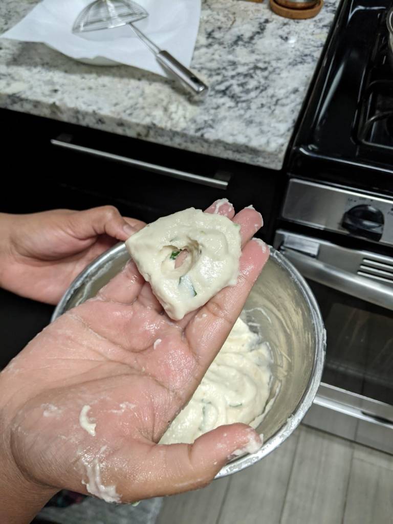 • Once the oil is ready, dip your hand in the bowl of water, including the thumb. Take about 1/4 cup of batter into your hand and let it sit on your fingers – leave the thumb out, need the thumb to make the vada hole. Use your thumb to make a hole in between. Once it looks good, drop it into the hot oil. Here the water on your palm, fingers and thumb helps to shape the vada and also drop it into the oil. The hole in between ensures even cooking and frying of the vada