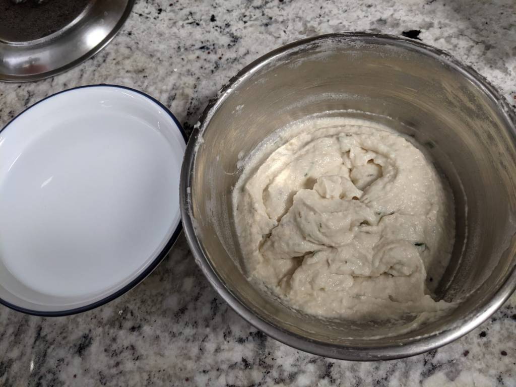 • Now, dip your palm in a bowl of water and try to beat the batter by hand. This helps aerate it more. If the batter feels stiff here, add a teaspoon of water at a time only and continue to beat for about 2-3 minutes. You will notice that the batter looks fluffier than when ground. Now, have a bowl of water as well ready next to the batter, so you can dip your hand every now and then.