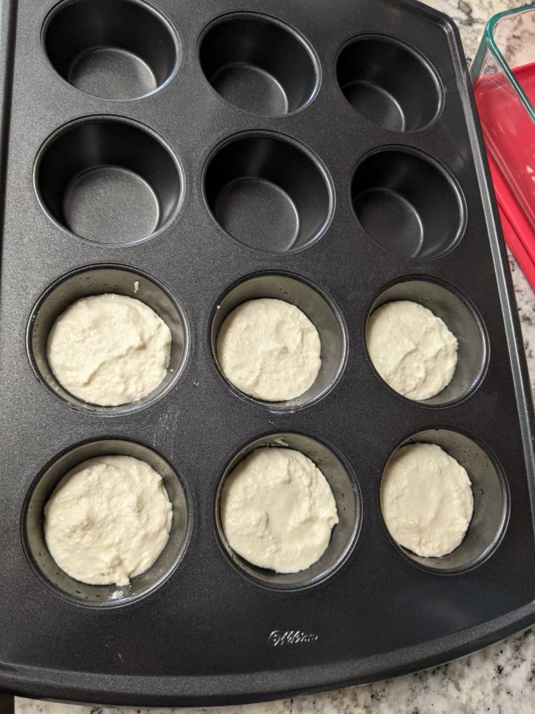 - Mix the Ricotta cheese with the sugar. Distribute it evenly in the muffin pan as patties.