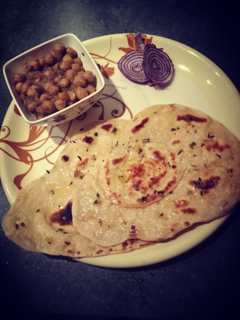3. Pluck out lemon sized balls. Dust them with some flour and roll them to sheets of medium thicknesses. Roll them to naan like elongated shape. Sprinkle with some cumin seeds and roll them so that they stick to the rolled dough.